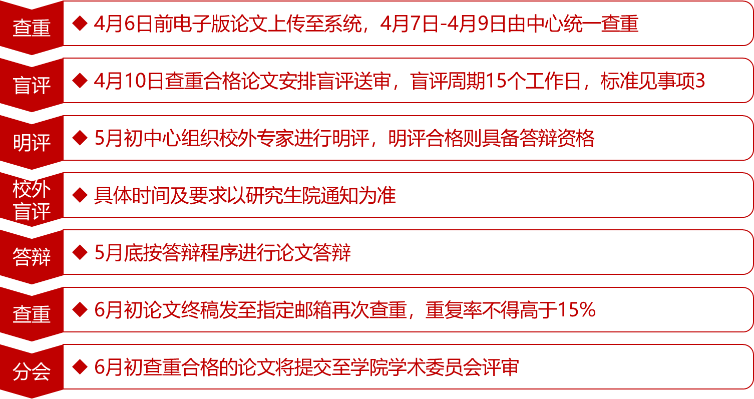 2024年夏季预毕业生论文盲评工作即将开始,具体论文培养环节如下,以下任一环节不合格,则需根据学制办理延期或结业: