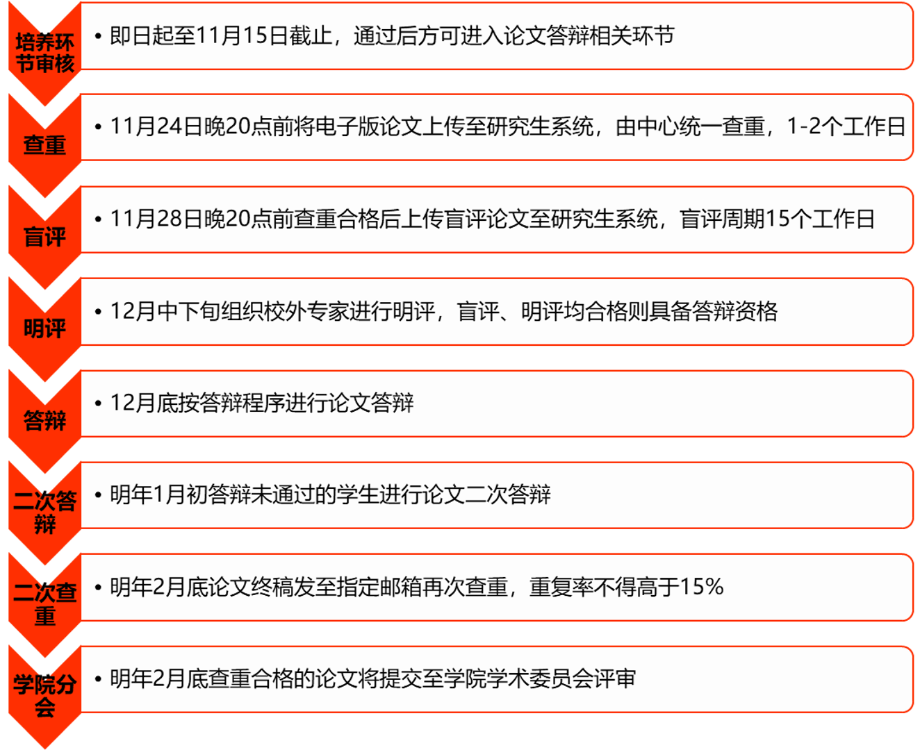 计划2025年3月毕业的学生务必于11月15日下午15点前通过研究生系统中培养环节审核且不拖欠学费,方可具备查重及盲评资格。未按时提交论文的同学视为延期毕业,已达最长学制且未提交论文同学按相关规定予以结业(肄业)处理研究生系统填报流程请见附件3具体工作事项及说明如下: